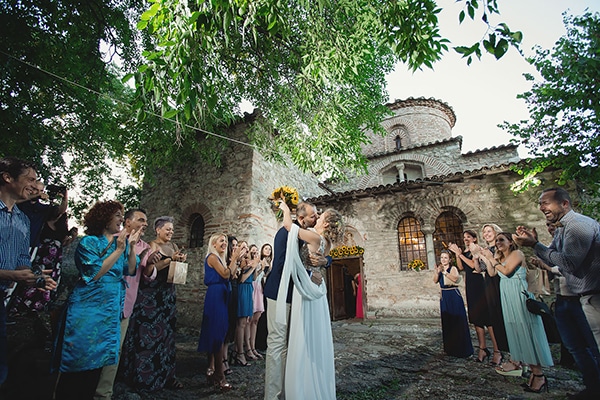 «Τα αγαπημένα μου λουλούδια είναι οι ηλίανθοι και το στυλ του γάμου μας ήθελα να είναι boho chic με έντονο το στοιχείο της δαντέλας και τα αγαπημένα μου χρώματα, πράσινο και κίτρινο. Όλη τη διακόσμηση την ανέλαβε η Μαρίνα Χαριτοπούλου (Concept Events Planning) με το αποτέλεσμα να είναι εκπληκτικό και να μας χαρίσει μία μαγευτική ατμόσφαιρα τόσο στην εκκλησία όσο και στο πάρτυ του γάμου.»