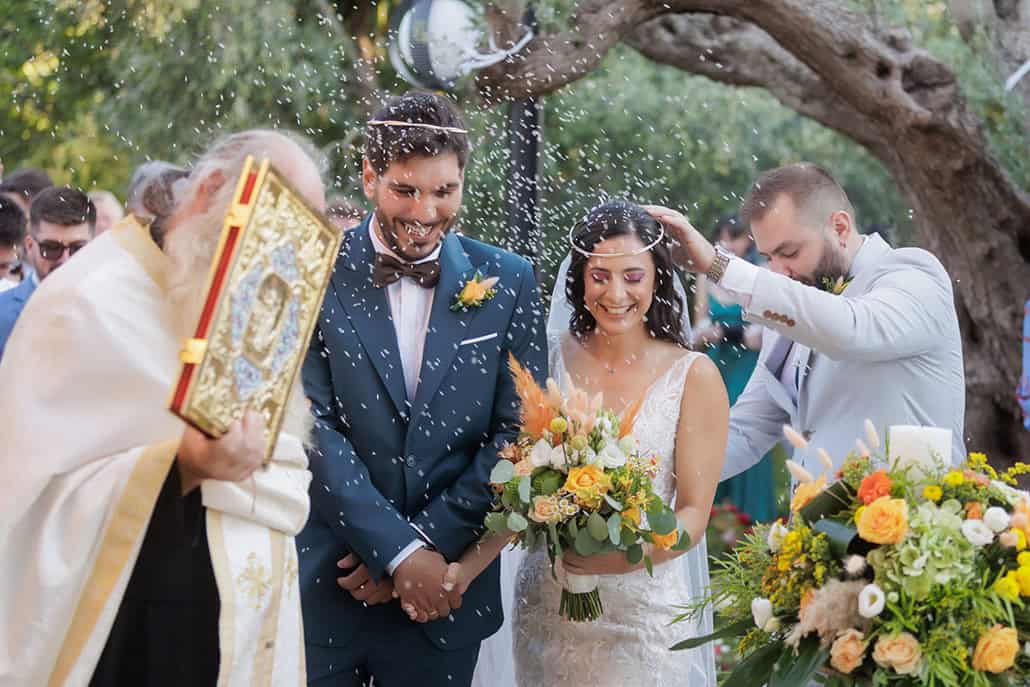 Πολύχρωμα λουλούδια στο κίτρινο, πορτοκαλί και λευκό συνδυάζονται με pampas grass και πρασινάδες, στολίζοντας με τον πιο όμορφο τρόπο τους υπέροχους εξωτερικούς χώρους του Κρωπίας Γη, εκεί όπου πραγματοποιήθηκε ο καλοκαιρινός γάμος της Σάντρας και του Αντώνη. Το ευτυχισμένο ζευγάρι επιλέγει το μικρό πετρόκτιστο εκκλησάκι του κτήματος για την τελετή του γάμου του, με αγαπημένους φίλους και συγγενείς να τους πλαισιώνουν, ενώ με το πέρας του μυστηρίου το σκηνικό μεταφέρεται στην στον χώρο της γαμήλιας δεξίωσης, εκεί όπου το ζευγάρι κάνει την είσοδο του με τη συνοδεία πυροτεχνημάτων, για να ακολουθήσει ένα ξέφρενο γαμήλιο πάρτι μέχρι πρωίας. Don’t miss it!