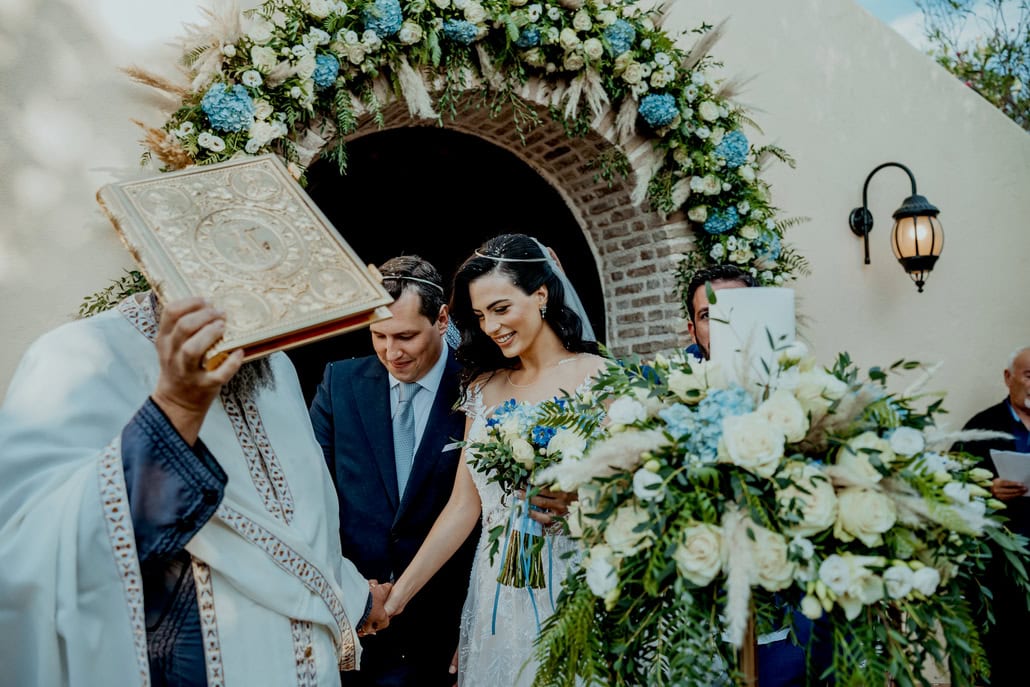 «Μας αρέσουν πολύ τα λουλούδια και θέλαμε αυτό το κομμάτι να είναι αρκετά έντονο και να ξεχωρίζει. Οπότε επενδύσαμε πολύ στο στολισμό της εκκλησίας, της δεξίωσης και γενικά του χώρου. Ο γάμος μας συνδυάστηκε με τη βάφτιση του γιου μας, οπότε οι αποχρώσεις που διαλέξαμε περιείχαν λευκό για το γάμο και μπλε για τη βάφτιση. Είναι ένα χρώμα που λατρεύουμε! Το κύριο λουλούδι της νυφικής ανθοδέσμης ήταν γαλάζια ορχιδέα. Αποτελούνταν επίσης, από λευκά τριαντάφυλλα και δελφίνιουμ. Στον υπόλοιπο στολισμό προσθέσαμε και φυσικό pampas grass. Το στυλ της διακόσμησης, θέλαμε να εμπνέει κομψότητα. Οι λεπτομέρειες που μας έκαναν ιδιαίτερη εντύπωση, τόσο σε εμάς όσο και στους καλεσμένους μας, ήταν ο διάδρομος της εκκλησίας που αποτελούνταν από 20 ανθοστήλες αριστερά και δεξιά και στη μέση υπήρχε λευκό χαλί. Οι ίδιες ανθοστήλες διακοσμούσαν και τις ροτόντες της δεξίωσης. Επίσης, εκπληκτική ήταν η διακόσμηση του νυφικού τραπεζιού καθώς η είσοδος και το candybar του χώρου.»