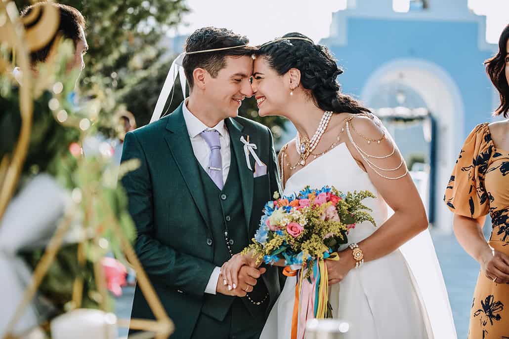 «Τη διακόσμηση του γάμου μας επιμελήθηκε η φανταστική Σταυρούλα Τριπιλιώτη, την οποία εμπιστευτήκαμε απόλυτα και είχε το ελεύθερο από εμάς να δημιουργήσει βάσει του στυλ που θέλαμε: bohemian chique! Πολύχρωμα λουλούδια, πολύχρωμες κορδέλες και χρυσά έντονα διαχρονικά στοιχεία απέπνεαν την allegria και χαρά μας αναδεικνύοντας το απέραντο υπέροχο γαλάζιο της θάλασσας! Η νυφική ανθοδέσμη αποτελείτο από πολύχρωμες παιώνιες, χαμομήλι, αλστροεμερια, σολινταγκο , λυσίανθους και τριανταφυλλάκια, και φυσικά πολύχρωμες μακριές κορδέλες! Οι λεπτομέρειες που μας άρεσαν πιο πολύ στην εκκλησία ήταν οι χρωματισμένες λάμπες με λουλουδάκια που κρέμονταν από τα δέντρα και οι κορδέλες, τα οποία μας τα έκανε έκπληξη η Σταυρούλα! Στη δεξίωση αγαπημένο στοιχείο της διακόσμησης ήταν τα χρυσά στρογγυλά rings με κορδέλες για το μπάρ και λουλούδια με κορδέλες για τις πέργκολες, τα οποία έφτιαξα ένα προς ένα με πολλή αγάπη εγώ η ίδια!»