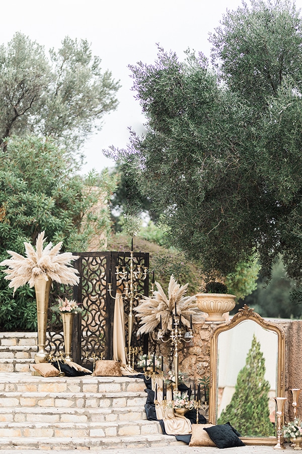 Πανέμορφα gold bamboo stands με ψηλά pampas grass & pink astilbe, δημιουργίες της Rosetta Eventi, καθώς και delicate χαμηλά χρυσά βάζα με bombastic & talea roses αποτέλεσαν το κύριο χαρακτηριστικό της φωτογράφισης. Η νυφική ανθοδέσμη εντυπωσιακή και ρομαντική ταυτόχρονα. Οι φίνες έντονες γραμμές διακόσμησης αναδεικνύονται μέσα από εντυπωσιακά διακοσμητικά όπως παλαιωμένα χρυσά chandeliers με μαύρα κεριά σε διάφορα μεγέθη, ψηλά επιβλητικά βάζα, χρυσοί αντικέ καθρέπτες & παραβάν, βελούδινα μαξιλάρια, όλα από την Prop Deco Rentals.