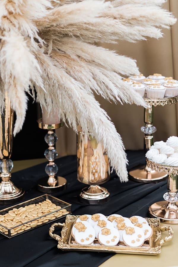 Στο χειροποίητο εντυπωσιακό Black & Gold Elegant Dessert Table, χρησιμοποίησα το αγαπημένο μου vintage χρυσό τραπέζι καθώς και χρυσά σετ σερβιρίσματος από την προσωπική μου συλλογή. Πάνω τους τοποθετήθηκαν custom made δημιουργίες όπως cake pops, cup cakes, cookies, όλα σχεδιασμένα με πινελιές από χειροποίητα gold fleurs.