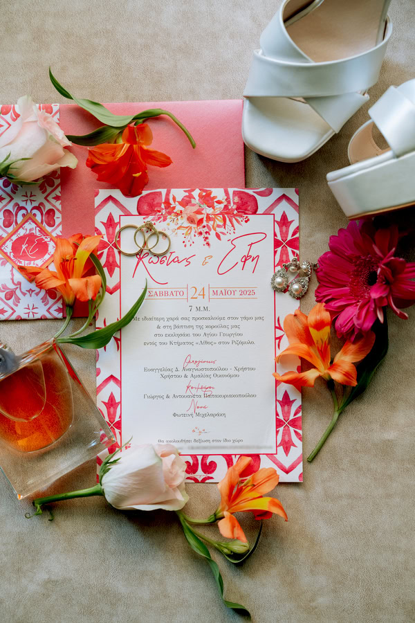 Ο γάμος της Έφης και του Κώστα είχε μια ξεχωριστή, μοντέρνα και bright αισθητική που αποτυπώθηκε σε κάθε λεπτομέρεια, με την Gia Sena Mono Olga Georgiadi Collection να αναλαμβάνει με μοναδικό τρόπο την οργάνωση και τον στολισμό αυτής της υπέροχης ημέρας, χαρίζοντας ένα αποτέλεσμα που εντυπωσίασε όλους τους παρευρισκόμενους. Οι αποχρώσεις του φούξια, του κίτρινου και του πορτοκαλί κυριάρχησαν στη διακόσμηση, με ζέρμπερες, ντάλιες και τριαντάφυλλα να δημιουργούν τις πιο όμορφες συνθέσεις που γέμισαν ζωντάνια τους χώρους της δεξίωσης. Το ξεχωριστό γεωμετρικό σχέδιο που θυμίζει μεσογειακά ή μαροκινά πλακάκια, εμφανιζόταν τόσο στο προσκλητήριο όσο και στα τραπέζια καθώς και σε πολλές άλλες διακοσμητικές λεπτομέρειες, δίνοντας ενιαία ταυτότητα στο σκηνικό. Οι καλεσμένοι έμειναν με τις καλύτερες εντυπώσεις για τη διακόσμηση στα τραπέζια της δεξίωσης με τα κεράκια και τα πολύχρωμα λουλούδια που χάριζαν μια ατμόσφαιρα γιορτής. «Ο γάμος υπήρξε μια από τις πιο όμορφες και έντονες στιγμές στη ζωή μας!» είπε η νύφη, και πραγματικά οι φωτογραφίες μιλούν από μόνες τους, αποτυπώνοντας μια μέρα γεμάτη χαρά και αγάπη.