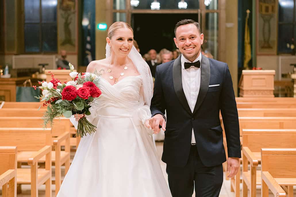 «Όταν αποφασίσαμε πως ο γάμος θα γίνει αρχές Δεκεμβρίου, ήμουν σίγουρη πως ο χαρακτήρας που ήθελα να έχει ήταν festive και Χριστουγεννιάτικος. Αυτό το καταφέραμε στο 100%. Είχα κάποιες ιδέες τις οποίες και μοιράστηκα με τον Γιώργο και τον Σταμάτη στην Χλωροφύλλη, οι οποίοι και δημιούργησαν τις πιο όμορφες συνθέσεις. Θέλαμε έντονες πρασινάδες όπου και έγινε. Χρησιμοποιήθηκαν χειμωνιάτικες πρασινάδες σε γκριζοπράσινες αποχρώσεις, όπως ευκάλυπτος, έλατο, πεύκο κ.α. Τα λουλούδια επίσης και στην ανθοδέσμη μου αλλά και στην συνολική διακόσμηση είχαν επίσης γιορτινά χρώματα όπως λευκό, σομόν, κόκκινο και μπορντό. Κάποια από τα λουλούδια που χρησιμοποιήθηκαν ήταν η ορτανσία, τριαντάφυλλα, ίλεξ και άλλα. Οι λεπτομέρειες με τα κεριά στα τραπέζια και τα φαναράκια που διακοσμούσαν την εκκλησία ολοκλήρωσαν τον υπέροχο στολισμό. Ήταν πολλοί οι καλεσμένοι που σχολίασαν θετικά τον στολισμό λέγοντας πόσο ιδιαίτερος και γιορτινός ήταν».
