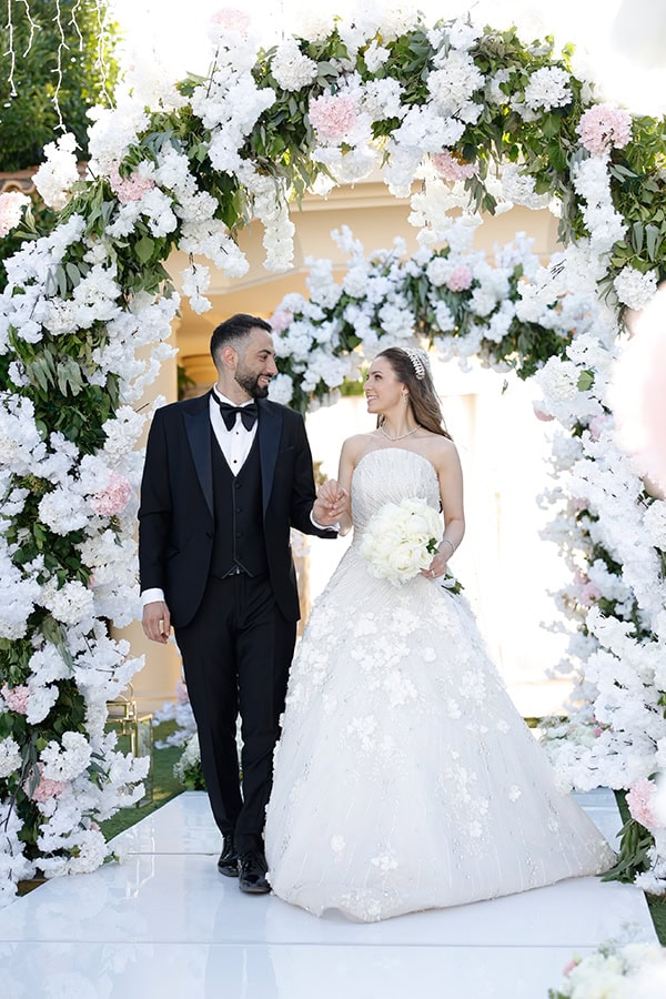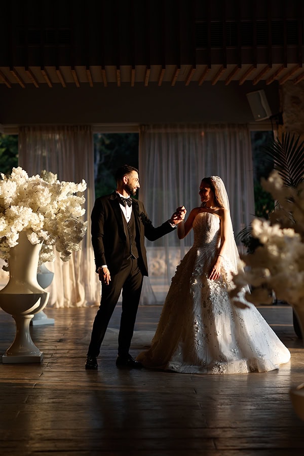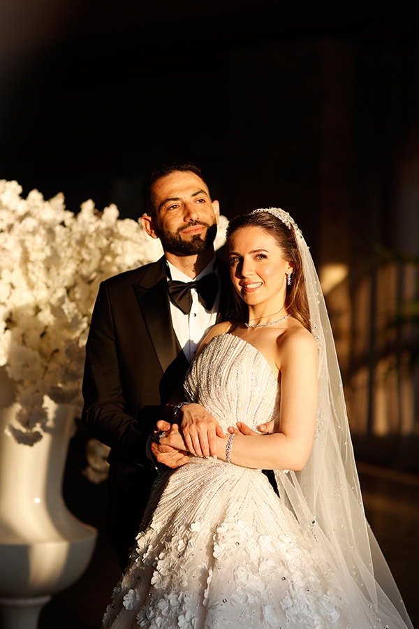 Ο destination γάμος της Raneem και του Fares ήταν μια γιορτή γεμάτη ultra glamorous λεπτομέρειες και μια αίσθηση αληθινής πολυτέλειας, που ξεδιπλώθηκε στο Κτήμα Ορίζοντες με ένα όραμα προσεγμένο από την πρώτη κιόλας στιγμή που περνούσε κανείς την είσοδο. Με την καθοδήγηση της Fevronia Luxury Concepts, η ημέρα κύλησε αβίαστα από την τελετή στη δεξίωση, δεμένη αρμονικά μέσα από ένα εκλεπτυσμένο garden concept βασισμένο σε λευκές και ιβουάρ αποχρώσεις με διακριτικές πινελιές απαλού ροζ. Τρεις εντυπωσιακές λουλουδένιες αψίδες υποδέχονταν τους καλεσμένους στην είσοδο και έθεταν αμέσως τον τόνο, οδηγώντας σε έναν χώρο τελετής διαμορφωμένο με πολλαπλές αψίδες ντυμένες με καταρράκτες από λευκές ορτανσίες, τριαντάφυλλα, ranunculus και απαλές blush λεπτομέρειες, δεμένες με πλούσιο πράσινο. Η δεξίωση ακολούθησε την ίδια αισθητική, με τραπέζια στολισμένα με χαμηλές και πλούσιες ανθοσυνθέσεις σε διάφανα γυάλινα βάζα, κρυστάλλινα κηροπήγια, ψηλά λευκά κεριά και μια απαλή λάμψη που συνόδευε τη βραδιά μέχρι αργά, ενώ οι κρεμαστές floral εγκαταστάσεις πάνω από την πίστα χορού επαναλάμβαναν τις αψίδες από κάτω και αιωρούνταν ανάμεσα σε κρυστάλλινους πολυελαίους. «Η διακόσμηση του γάμου μας ήταν elegant και ρομαντική και όλα είχαν να κάνουν με τα λουλούδια, λουλούδια, λουλούδια! Κρατούσα ένα νυφικό μπουκέτο από λευκές παιώνιες. Ονειρικοί πολυέλαιοι και λαμπερά fairy lights φώτιζαν τον χώρο, κάνοντάς τον να μοιάζει μαγικός. Τρεις λουλουδένιες αψίδες πλαισίωναν την είσοδο και τα τραπέζια της δεξίωσης ήταν γεμάτα με λουλούδια, κεριά και κρυστάλλινες λεπτομέρειες.» μας μοιράστηκε η νύφη, συνοψίζοντας ιδανικά έναν σχεδιασμό όπου τα άνθη είχαν τον πρωταγωνιστικό ρόλο. Το γαμήλιο δείπνο επιμελήθηκε το Dipnosofistirion Catering με ένα μενού που ταίριαζε απόλυτα με την ατμόσφαιρα τόσο σε παρουσίαση όσο και σε ροή, ενώ η ενέργεια της δεξίωσης κορυφώθηκε τη στιγμή που οι Black and White Drums πήραν θέση, δίνοντας τον παλμό και μετατρέποντας τη βραδιά σε ένα ξέφρενο πάρτι που κράτησε αμείωτο τον ενθουσιασμό μέχρι το τελευταίο λεπτό!
