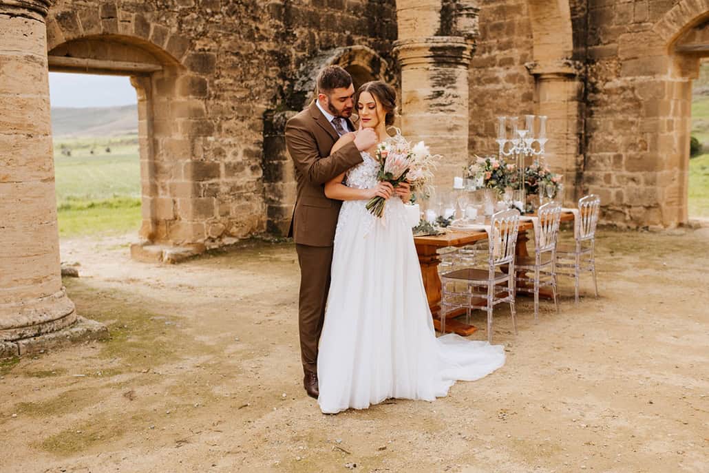 Ρομαντικές dusty peach αποχρώσεις, κρυστάλλινες λεπτομέρειες και bohemian πινελιές συνθέτουν ένα πολύ ονειρικό styled shoot… Με φόντο πετρόκτιστες καμάρες και κολώνες να αποπνέουν τη διάθεση μιας άλλης εποχής, στήθηκε ένα εντυπωσιακό setting με ρομαντικά αλλά και bohemian στοιχεία που εμείς λατρέψαμε! Ένα ξύλινο τραπέζι εμπλουτίστηκε με πανέμορφες ανθοσυνθέσεις με dried flowers (a 2020 wedding trend we love!) από Googoo Designs με πινελιές από dried flowers, πρωτέα και pampas grass, ενώ οι ghost καρέκλες που το περιτριγύριζαν ταίριαξαν απόλυτα με τα κρυστάλλινα κηροπήγια και το elegant tableware απογειώνοντας το αποτέλεσμα. Πρωταγωνιστές ένα υπέροχο ζευγάρι που απόλαυσε το πιο ρομαντικό δείπνο υπό το χαμηλό φως τον κεριών χαρίζοντάς μας μοναδικές εικόνες…