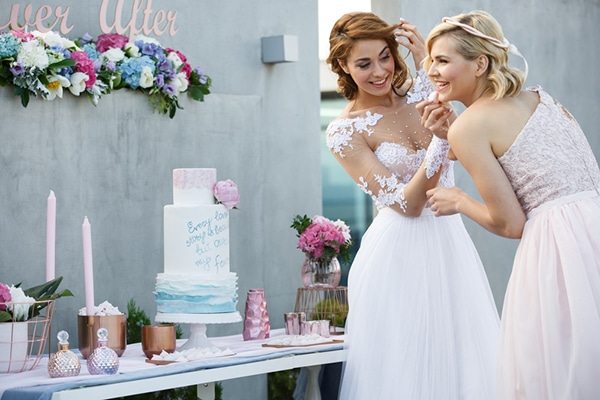 Από το COZY Fairytales: “Tα πιο αιθέρια χρώματα της χρονιάς σύμφωνα με το Ινστιτούτο Pantone, ήταν η έμπνευση και ο “καμβάς” του πιο ρομαντικού styled shoot, που πραγματοποιήθηκε από το COZY Fairytales magazine και την super talented event planner Κωνσταντίνα Λαφάρα της Soo Events, το οποίο αποτυπώθηκε στον φωτογραφικό φακό της Αμάντας Πρωτίδου και του Παύλου Γιαταγαντζίδη της Otravista Photography. “The bride and her maid of honor” θα μπορούσε να είναι ο τίτλος του ανέμελου αυτού concept, που με τις γλυκιές αποχρώσεις των λουλουδιών, τα γλυκά και τα διακοσμητικά που επιλέχθηκαν για το dessert table, μας διηγείται το πιο όμορφο παραμύθι. Το υπέροχο pastel σκηνικό στήθηκε στο roof garden του ξενοδοχείου Porto Palace με την ομορφότερη θέα της Θεσσαλονίκης από ψηλά. Ένα dessert table όλο γλύκα, στις candy αποχρώσεις Rose Quartz και Serenity, φιλοξένησε κεριά, διακοσμητικά και σκεύη σε ροζ χρυσό, συνθέσεις από ροζ παιώνιες και baby blue ορτανσίες, καθώς και μία πανέμορφη τριώροφη τούρτα στα ίδια χρώματα, με το πιο ξεχωριστό μήνυμα αγάπης.”