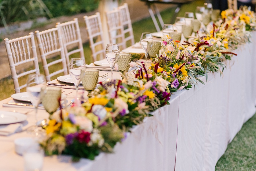 Ιδιαίτερος στολισμός γαμήλιου τραπεζιού, με λουλουδένια γιρλάντα από χρυσά ανθούρια, κόκκινα μπορντό τριαντάφυλλα και ορτανσίες μαζί με πληθώρα κεριών πάνω σε βαθύ κόκκινο ύφασμα. ...