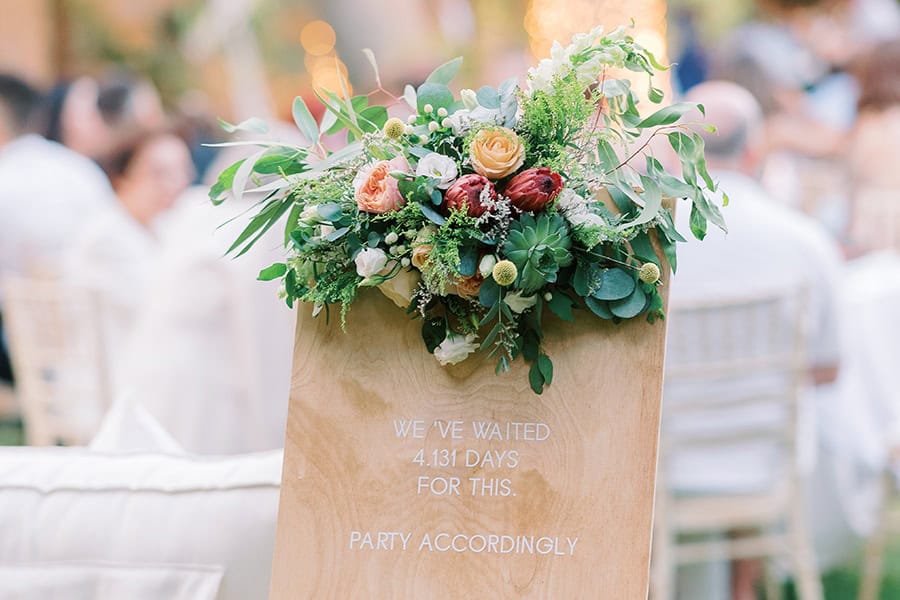 Εντυπωσιακός στολισμός δεξίωσης εξωτερικού χώρου με ξύλινη πινακίδα καλωσορίσματος καλεσμένων σε ρουστίκ ύφος. Διακοσμείται με πλούσια πρασινάδα, κόκκινη πρωτέα και τριαντάφυλλα σε παστελ χρώματα. ...