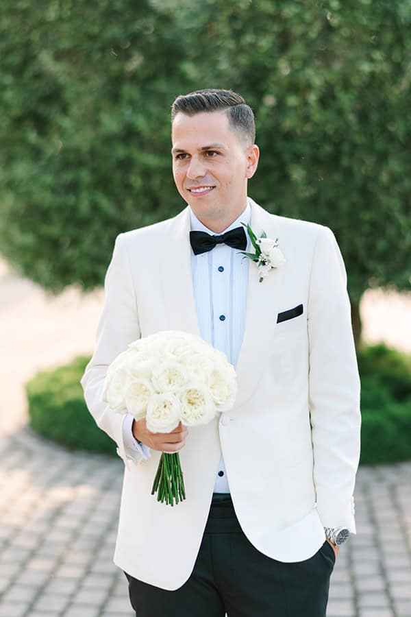 Μονόχρωμο νυφικό μπουκέτο με λευκές παιώνιες