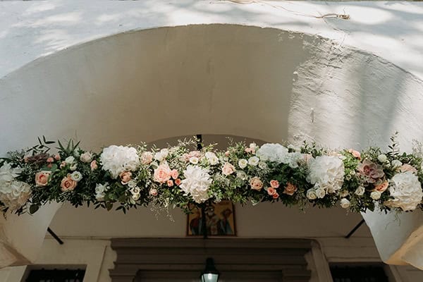 Στολισμός εισόδου εκκλησίας με γιρλάντα απο ορτανσίες, τριαντάφυλλα garden roses, λυσίανθους, astilbe, brunia και ευκάλυπτο σε dusty pink, πράσινο και λευκό χρώμα.
