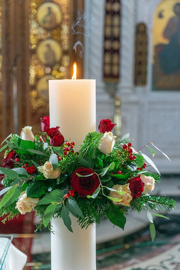 Χειμωνιάτικη διακόσμηση λαμπάδας γάμου με κόκκινα τριαντάφυλλα και γκι