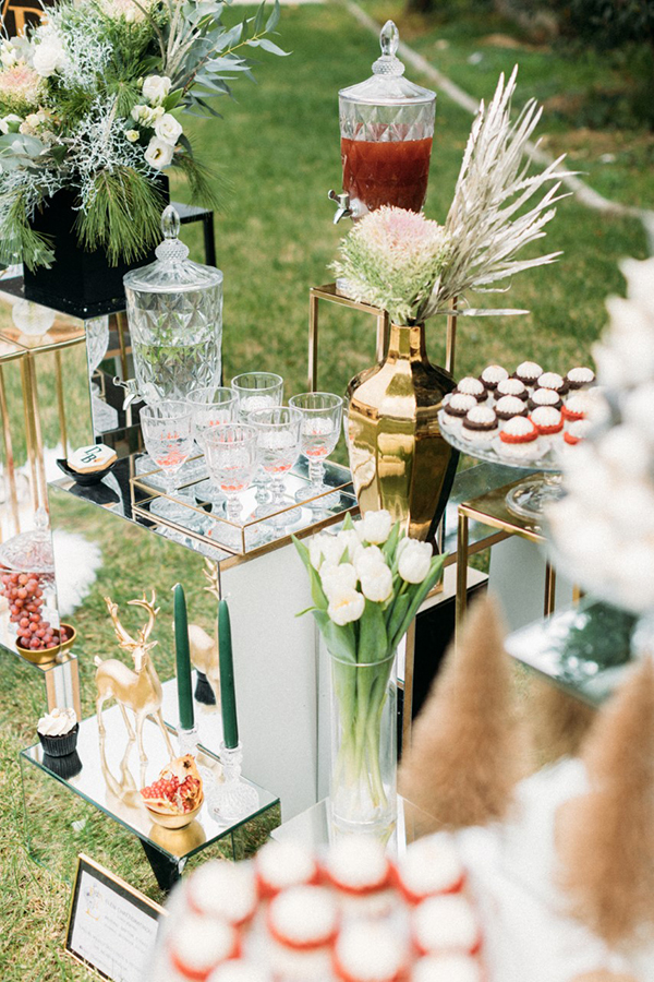 Elegant στολισμός drink stand με υπέροχα λουλούδια και χρυσά διακοσμητικά