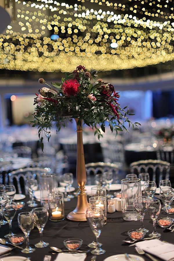 Στολισμός στρογγυλών τραπεζιών δεξίωσης με μαύρα τραπεζομάντηλα. Χρυσές ανθοσυνθέσεις με υπέροχα λουλούδια στολίζουν το κέντρο του τραπεζιού σε συνδυασμό με κεριά σε βαζάκια.