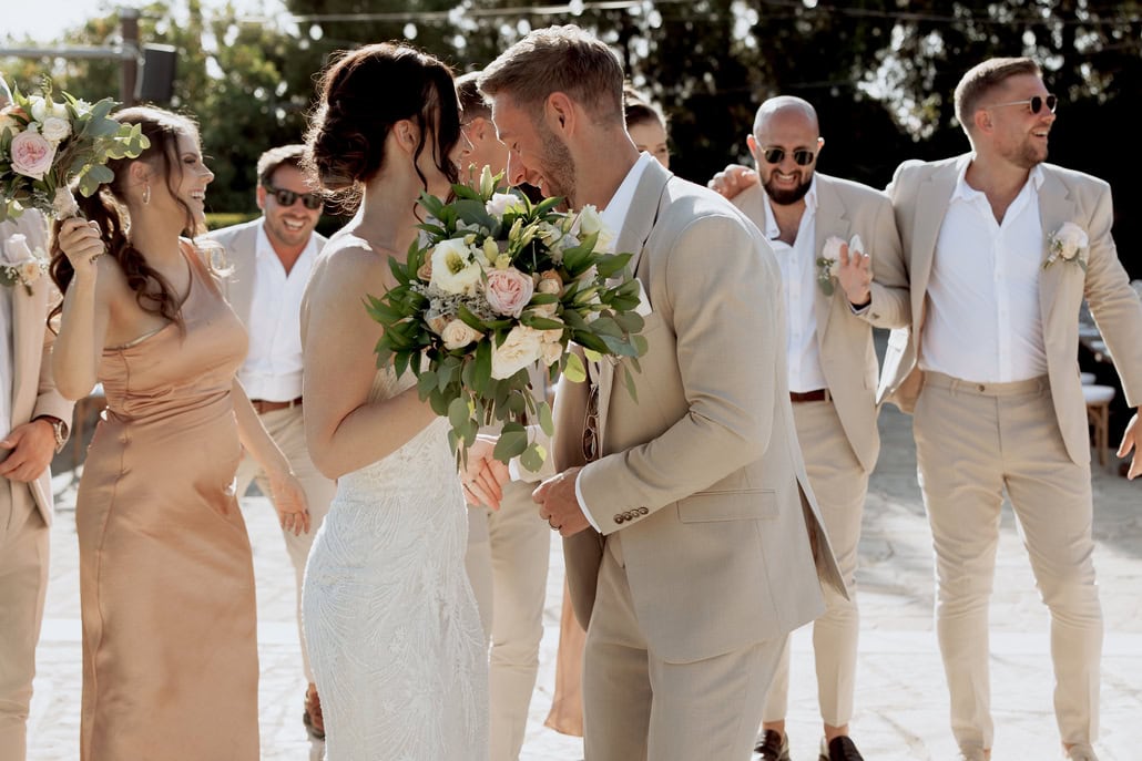 «Θέλαμε πραγματικά διαχρονική διακόσμηση και λουλούδια. Ήξερα ότι ήθελα κυρίως πρασινάδα και λευκά άνθη, με λίγες απαλές αποχρώσεις ροδακινί και πορτοκαλί. Το Liopetro μας έδωσε μερικές προτάσεις για ανθοπωλεία και ήρθαμε σε επαφή με κάποιους. Ένας ξεχώρισε, του έστειλα φωτογραφίες για έμπνευση, μιας και η αλήθεια είναι πως δεν γνωρίζω από ονόματα λουλουδιών, και μου είπαν απλώς: “Αφήστε το σε εμάς”. Και χαίρομαι τόσο που το κάναμε! Τα λουλούδια ήταν υπέροχα, φρέσκα και λαμπερά και έδωσαν μια τέλεια διακριτική πινελιά χρώματος. Γενικά, για τη διακόσμηση θέλαμε μια καθαρή, διαχρονική αίσθηση – το λιγότερο ήταν περισσότερο για εμάς. Επιλέξαμε απλές διακοσμήσεις τραπεζιών ώστε οι καλεσμένοι να μπορούν να συζητούν. Καθίσαμε ανάμεσά τους, ανακατεμένοι, γιατί θέλαμε μια κοινωνική ατμόσφαιρα, να μιλάμε και να περνάμε καλά με τους αγαπημένους μας. Αυτό ήταν πραγματικά ένα από τα αγαπημένα μου κομμάτια – νιώθαμε τόσο αγαπημένοι και τυχεροί μέσα σε όλον αυτόν τον κόσμο…»