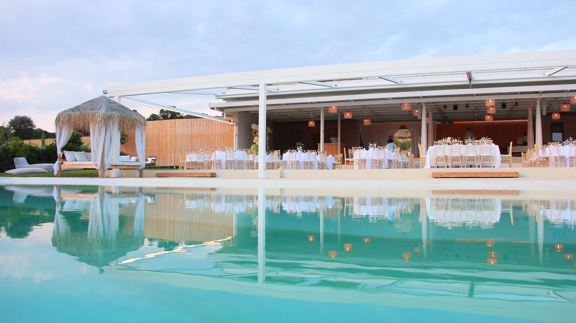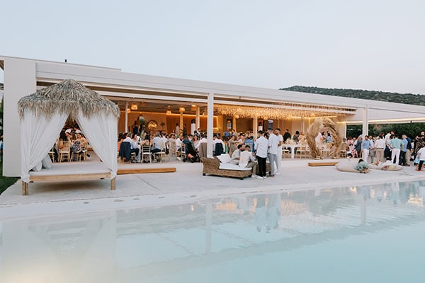 Ένα από τα μεγάλα προνόμια του κτήματος Αμάλθεια είναι η παρουσία ανοιγόμενης πέργκολας σε περίπτωση βροχής, έτσι ώστε τίποτα να μην διακόψει την δεξίωση σας. Στα πλεονεκτήματα διακρίναμε επίσης το πανέμορφο εκκλησάκι του Αγίου Νικολάου καθώς την beach style πισίνα που δίνει την αίσθηση της παρουσίας της θάλασσας, δημιουργώντας μια όμορφη καλοκαιρινή και ανάλαφρη ατμόσφαιρα.