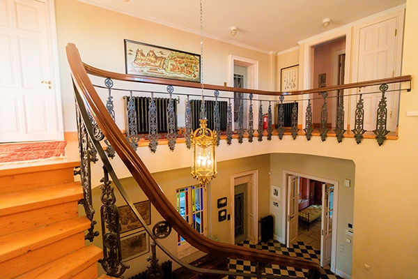 Μπαίνοντας στο κτήμα από τη σιδερένια πύλη, ανεβαίνετε το δρόμο που ελίσσεται μέσα από ένα δάσος με ώριμα δέντρα, μέχρι να φτάσετε στην εντυπωσιακή είσοδο της βίλας, η οποία βρίσκεται στο υψηλότερο σημείο του λόφου του κτήματος.