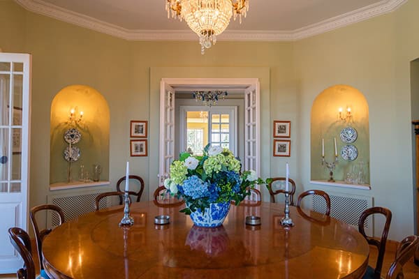 Στο ισόγειο είναι ένα μεγάλο σαλόνι με μαρμάρινο τζάκι, μια κομψή οκταγωνική τραπεζαρία και ένα καθιστικό για χαρτιά και άλλα παιχνίδια, όλα με εντυπωσιακά έργα τέχνης, μέρος της οικογενειακής συλλογής. Η εκτεταμένη βεράντα που οδηγεί στις βεράντες από το σαλόνι και την τραπεζαρία έχει εκπληκτική θέα όπου μπορείτε να απολαύσετε το ηλιοβασίλεμα.
